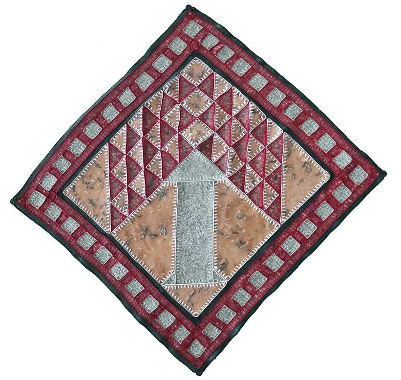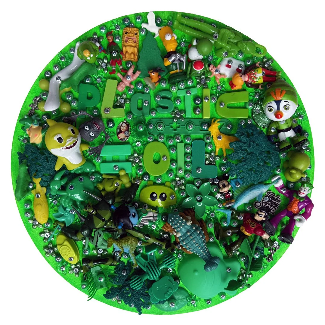 kHyal composes colorful constructions on discs packed with discarded plastic toys and nostalgic pop memorabilia. She is an environmental activist and digital art pioneer who has been working with recycled materials since the early 1980s, her works are a call to action, to find alternatives to plastic, and eliminate plastic pollution and our obsession with more and more “stuff.” Her worked is described as, “An homage to quirky handmade signage… Plus, a whirlwind of discarded plastic and pop iconography — stuck in a blender and fastened to a time capsule.” Learn more about kHyal’s work here.