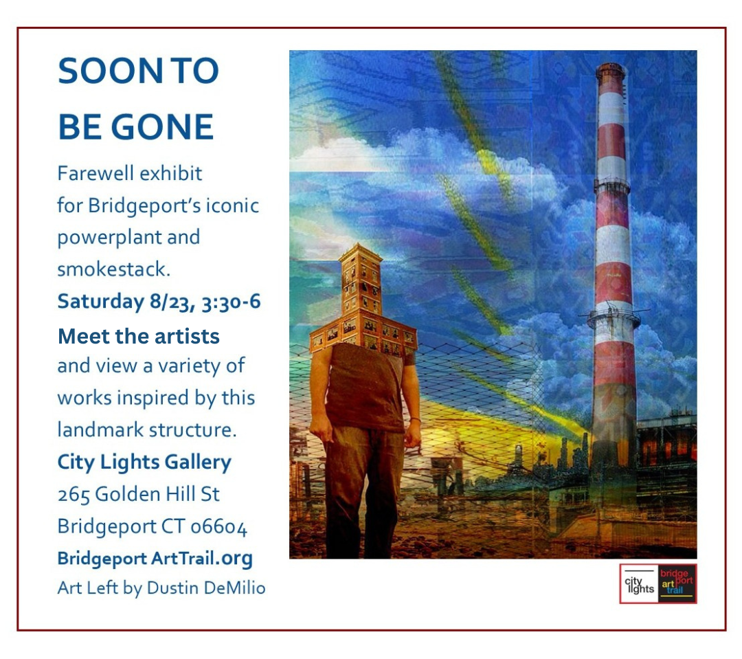 City Lights Gallery presents a variety of art inspired by the Bridgeport power plant smokestack as a farewell exhibit for the iconic structure that will be demolished this Fall. Meet the artists on Saturday August 23, from 3:30-6 pm.