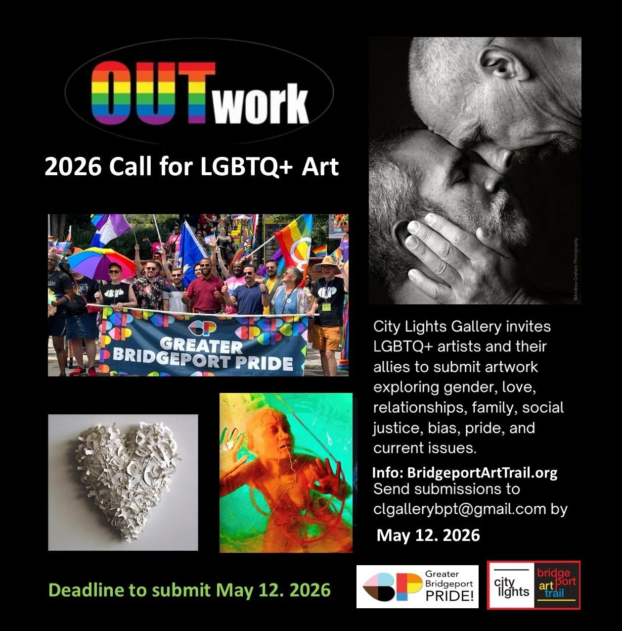 OUTwork explores issues of gender, LGBTQ life, love and relationships, family, social justice, bias, personal stories and perspectives, pride, current issues of 2026, etc. Artists need not be gay, lesbian, nonbinary, or transgender to participate. Allies are welcome. The intention is to support the greatest possible inclusion and to create a platform for people of diverse backgrounds to meet and exchange ideas and want to express their support and respect.